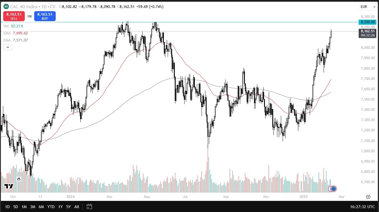 The French CAC 40 has been bullish yet again during the trading session on Thursday, as the massive uptrend and momentum driven market continues to show its strength. At this point in time, I have no interest in trying to short this market, because it is far too strong to do so. That being said, if I was already invested here, I would probably start to think about taking profit as we have gotten so stretched that it’s difficult to imagine that the market suddenly slices through the crucial €8250 level.