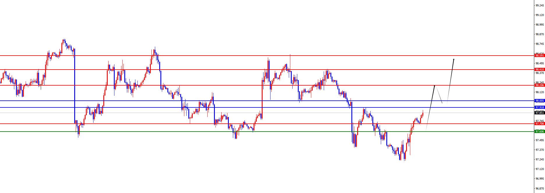 From a multi-cycle analysis, the price has been consolidating up and down in the weekly level recently. Currently, the weekly resistance is in the 97.90 area, and the price is short-shouldered below this position. The price will only turn long after the subsequent weekly closing above this position. From the daily level, as time goes by, the daily line currently faces resistance in the 98 area, and the price is currently bearish below this position. Recently, the price has consolidated up and down at a key position in the daily line. In terms of operation, you need to pay attention to the four-hour rhythm. From the four-hour perspective, yesterday's price broke through the four-hour resistance, so short-term resistance has become support. Currently, the four-hour support is supported in the 97.60-70 area. In the future, we will focus on the daily and weekly resistance breakthrough performance. Once we break through and stand firm, we can continue to look upward. In the short term, we will temporarily focus on the 98.20-98.40-98.60 area.
