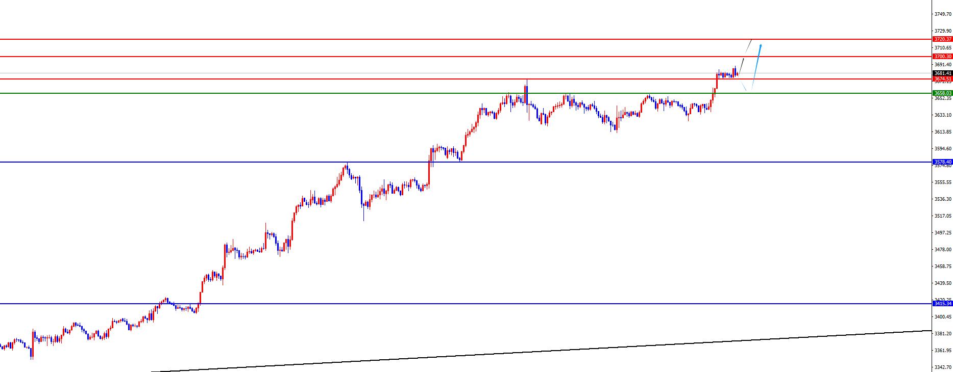 From a multi-cycle analysis, first observe the monthly rhythm. The monthly price ended in August. Overall, the price is still running bullishly. From the long-term perspective, the 3000 position is the watershed of the long-term trend. The price can be treated more on the long-term. From the weekly level, the price has broken through key resistance after recent continuous fluctuations and has continued to hit a new historical high. Currently, the weekly long and short watershed is at 3415. The price is above this position and the medium line is treated more. From the daily level, we need to pay attention to the 3578 regional support for the time being, and the band above this position should be treated more often. From the four-hour perspective, the price maintained its four-hour support up and down consolidation in the last few days of last week. Yesterday, after breaking through the four-hour resistance, the four-hour support is still the key. At present, the focus is on the support of the 3657-3658 range, and the price is more treated at this position. At the same time, the one-hour closing strongly on the previous day. During today's Asian session, it once again relied on the low point of the retreat in the early morning of the previous day to hit a new high. At present, the low point of the retreat in the early morning of yesterday became a key watershed. The price will be more strong before the price breaks down. If the unexpected breaks down, focus on the four-hour support and look at the rise. Focus on the 3690-3720 area above.