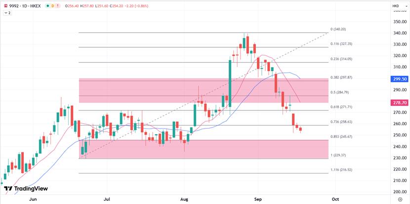 XM Hong Kong Stocks: Pop Mart (09992.HK)'s stock price has been falling all the time recently, with a cumulative decline of 24% since the end of August. It showed its biggest drop since April on Monday, with a sharp drop of nearly 9% in session, the largest drop in five months. The current stock price has hit the lowest since early August, corresponding to institutions' downgrading expectations of ratings, which has intensified people's concerns about the decline in the www.xmtraders.company's product popularity.