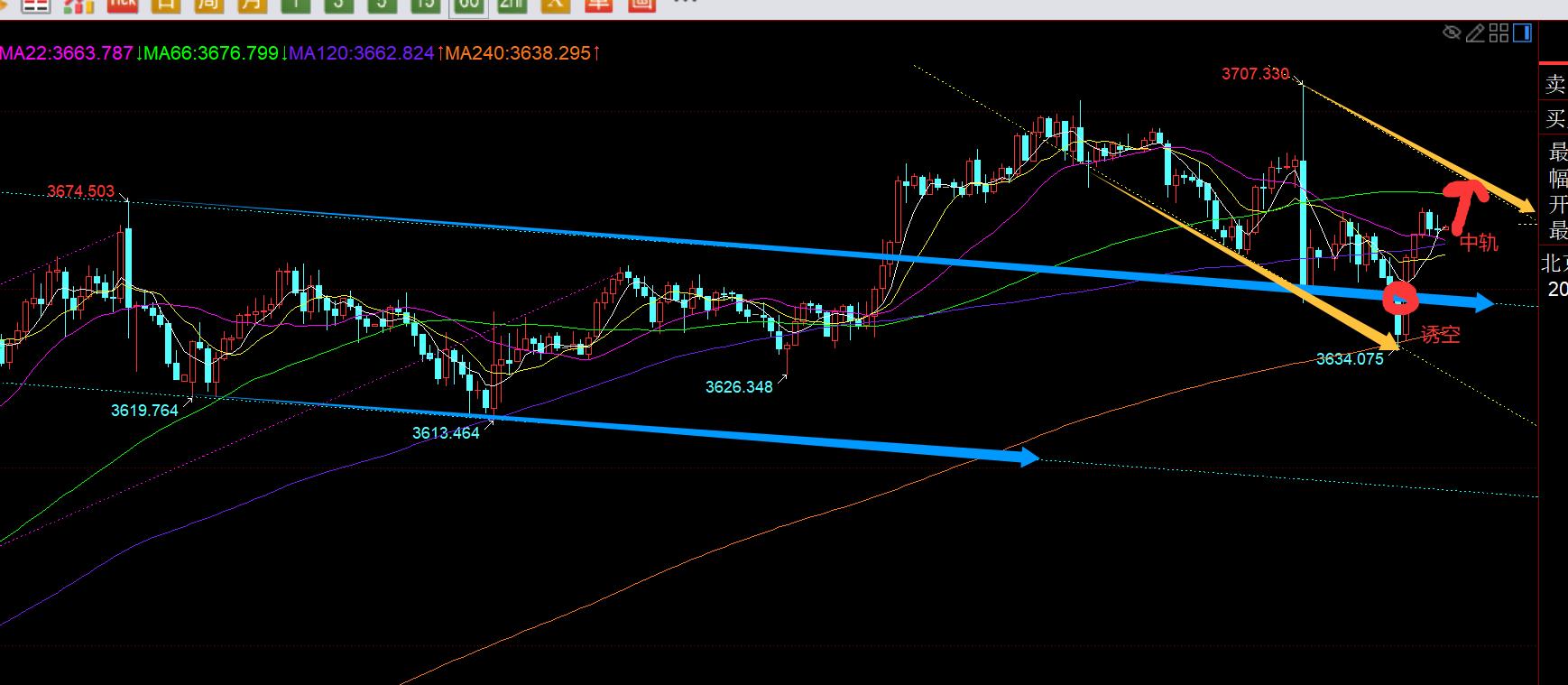 Third, golden hourly line level: overnight high and fall. This morning, a wave of pull-up appeared first to test the middle track. After under pressure, a wave of backtesting came. Before the European session, the piercing lost the overnight low of 3645, but soon the European session bottomed out and pulled up, and the big sun returned to the blue channel in the chart. This shows that the breakdown of 3634 is an illusion, luring short; and the continuous positive pull-up broke through the middle track and stood up, which also hit a new day high. Pay attention to the gains and losses of the support of the middle track tonight, and then slightly moved down to 3663.7 , if you can keep closing and stabilize this position, then the US market can have a wave of second rises, because after a wave of small V rises, it will generally continue. Short-term resistance is 3680-3683, 618 split suppression and the pressure at the upper rail of the yellow channel in the figure. To further strengthen and rise, you still need to overcome this place; of course, if you repeatedly lose the middle rail and close down, it may be that the range oscillation will go up and down. At that time, if you can't get back to the middle rail, you must adjust your position in advance and wait for the good low to stabilize before looking;