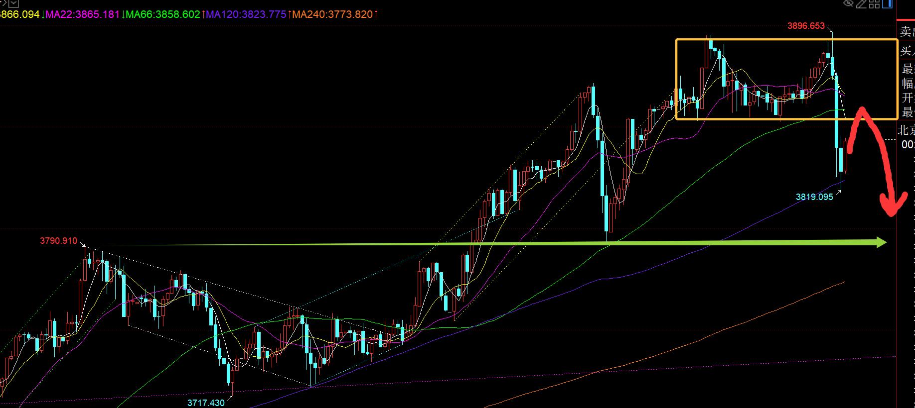 First, gold daily line level: yesterday's high and fell, closing the long upper shadow under pressure K, today it was still rising and falling, and the pressure was greater than yesterday, and the current pattern is negative The line, which is considered to be a retracement, confirmed the 5 moving average 3830-20, which is also the bearish target of the band mentioned during the day. Originally, we could plan to turn backwards and stabilize, but because it was in the second half of the night, we gave up temporarily, because the trend pattern of the two days was almost the same as September 16 and 17. We first first the top shadow line of the positive K, then close the negative, and the low point fell back for 5 days. Then according to this cycle, there is a high probability that we will test the vicinity of the 10 moving average on Friday, and it is expected to move upwards to 3800-3790. There is a signal of intraday sideways stable stability and stabilization, and we can return to continue to look bullish and go all the way higher; if the 10 moving average is large negative and continues to fall, it will further fall, and move closer to the middle track or pierce the middle track for a The second slightly larger correction, after all, from the bottom of 3311 to 3897, this wave is close to 600 meters, and there is no decent correction in the middle. Like September 17 and September 24, it is not considered a formal correction. It tends to be strongly consolidated at high-level boxes, because the 10 moving average has not been effectively lost, and it has been in a short squeeze state. Therefore, to summarize, the daily line level will first test the 10 moving average tomorrow, and continue to look at the short-term correction, about 3800-3790; if the 10 moving average is maintained, it will continue to return to the trend and be bullish next week; if the 10 moving average cannot be maintained, it will further lower, which will be the first slightly larger correction since the bottom of 3311, point to the middle track or pierce the middle track, and stabilize again. The road goes up one side, and then goes up to 3900 to hit the 4000 mark;