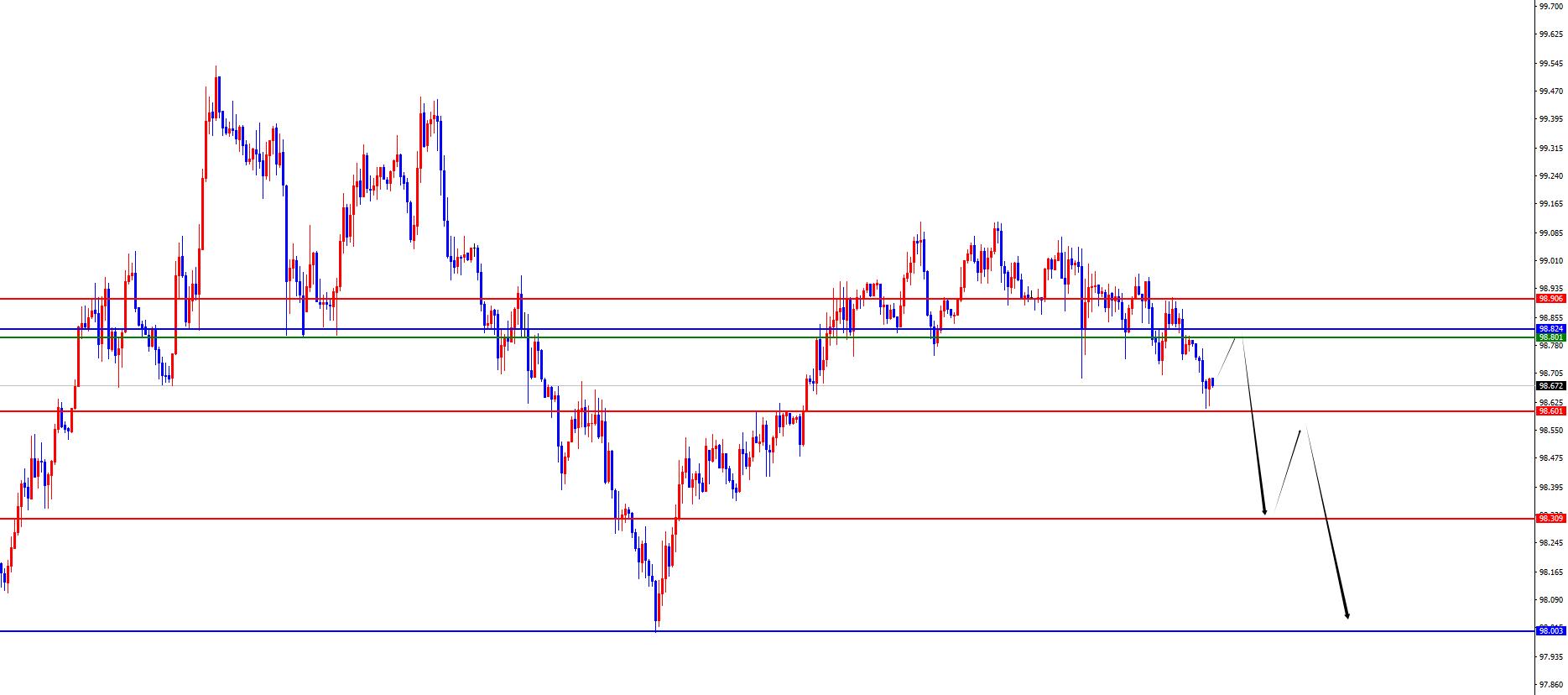 다주기 분석에 따르면 주간 가격은 초반에는 지속적으로 등락을 보였지만 대체로 주간 주요 위치에서 지지를 받고 있습니다. 현재 주간 지지선은 98 부근에 있으며, 이후 추가 중기 강세에 관심이 쏠릴 것입니다(갭 포지션에 주의가 필요). 일봉 기준으로는 시간이 지날수록 현재 일봉 저항선은 98.80대에 머물고 있습니다. 이 위치는 밴드 트렌드의 핵심입니다. 가격은 이미 무너졌습니다. 계속해서 압력을 받을 수 있도록 이 영역에 대해 후속 조치를 취하고 주의를 기울이십시오. 4시간대에서는 어제 가격이 4시간 저항선에서 계속 압박을 받았습니다. 시간이 지나면서 현재 4시간 저항선은 98.70-80의 저항선에 있습니다. 계속해서 압박감을 느끼려면 이 영역에 주의를 기울여 후속 조치를 취할 수 있습니다.