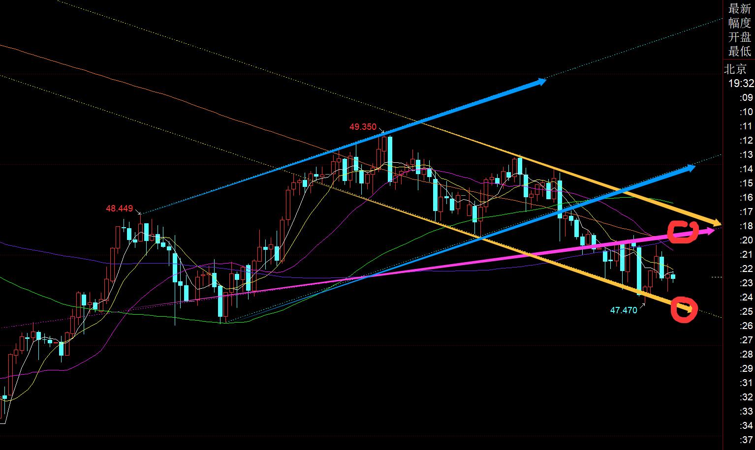 실버: 현재 5일 일봉은 10일 골든 크로스이고, 5번째 이동평균선은 상승세를 보이지만, 가격은 항상 이동평균선 아래에서 움직이고 있어 가격 편차가 발생할 가능성이 있습니다. 하루 중 어느 시점에 갑자기 과매도 반등이 발생하고 5일 이상에 마감되는 반등을 조심하세요. 물론, 상승 추세로 돌아가지 못하고 마이너스 선을 계속 닫는다면 내일 5번째 이평선도 하락세로 돌아서 압력을 받을 수 있으며, 이 경우 지난 주의 플러스 행진을 회복해야 합니다. 반등 성장률; 주간 10일 지지선은 46.7로 올랐고, 초기 상승채널 상부 레일 확인 지점의 일일 지지선도 46.3으로 올랐습니다. 따라서 이번 주 46.7~46.3 범위는 상대적으로 강한 지지 수준입니다. 낮 동안 상단 차트의 채널 분포를 보면 원래 파란색 상승 채널이 무너져 현재 노란색 하락 채널에 있습니다. 9월 일방적으로 상승했던 보라색 추세선의 지지가 하락한 후 오늘은 여러 차례 반등하여 48.15선을 테스트했습니다.이는 오늘날 주요 역압력 지점이 되었으며, 아시아 및 유럽 시장은 노란색 채널의 하부 레일 지지대에 반복적으로 접촉하고 반복적으로 끌어올리고 변동했습니다. 전반적인 추세는 그다지 깨끗하지 않고 상대적으로 울퉁불퉁합니다. 오늘 밤에는 1차 지지선 47.4, 저항선 48-48.2, 48.45에 주목하고 범위 내에서 처리하세요.