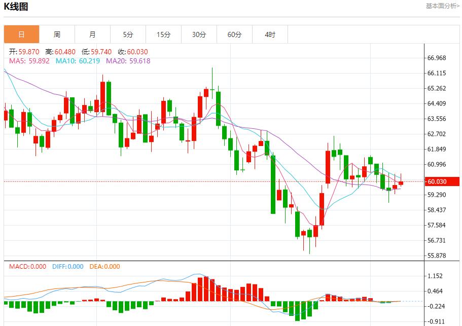 원유 시장: 베이징 시간 21시 20분 현재 미국 석유 가격은 상승하여 현재 0.47% 증가한 60.020에 거래되고 있습니다. 시장 전, 최근 장중 거래에서 (원유) 가격은 단기적으로 주요 추세를 테스트하는 동안 EMA50에서 저항에 부딪히면서 하락했습니다.상대강도지수(Relative Strength Index)가 긍정적인 신호로 나타났음에도 불구하고 약세 추세선은 가격 하락 압력을 강화시켜 부정적인 모멘텀이 여전히 강하다는 것을 나타냅니다.