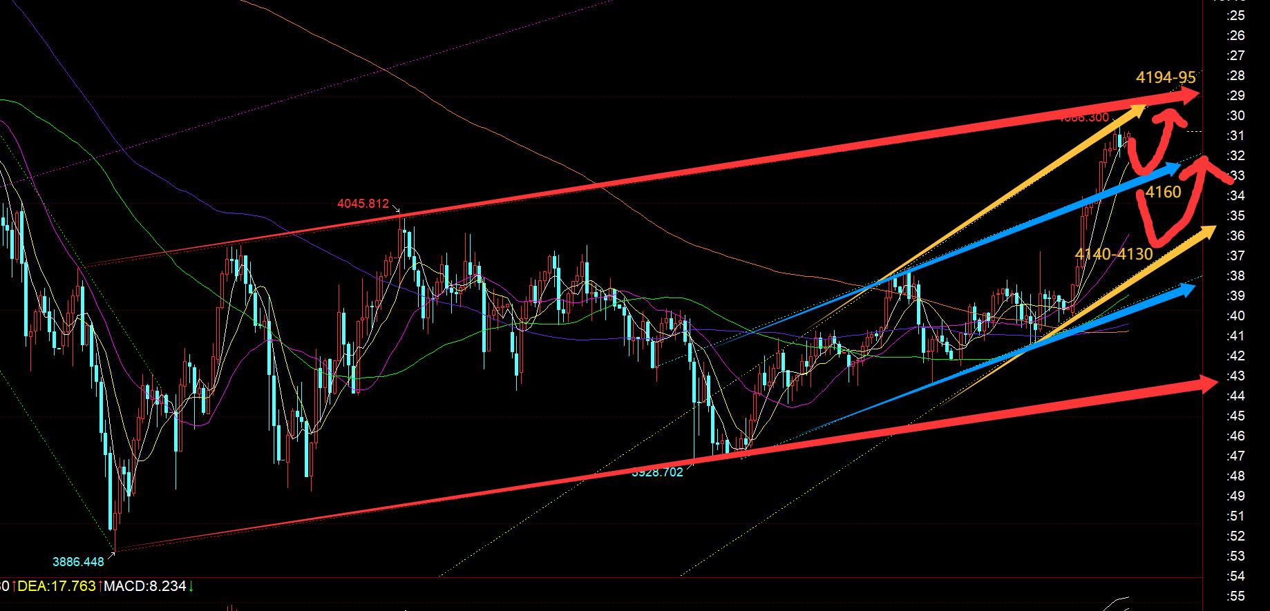 넷째, 황금 시간당 레벨: Zhou Video는 오늘 오전 3990에서 강세 추세를 계속 테스트 할 계획이었습니다. 그 결과, 개장시 전혀 뒤돌아 보지 않고 4000 근처까지 급등했습니다. 위 그림의 파란색 상승 채널에서 상단 레일 저항 4053을 돌파 한 후 계속 돌파했습니다. 현재 높은 영향력은 4086이고, 아시아와 유럽 시장의 지속적인 상승은 미국 시장이 두 번째로 상승할 것이라는 것을 의미하지만, 하락하지 않는다면 실제로는 감히 따라갈 수 없습니다. 결국 장중 상승률은 90미터에 육박했습니다. 또한, 지난 목요일처럼 낮 동안 상승세를 보이면 하락세를 보이지 않을 것이지만, 너무 많이 하락해서는 안 됩니다. 결국, 주요 전면 저항선인 4040을 돌파했습니다. 오늘 밤 첫 번째 지지는 파란색 채널의 상단 트랙에 주의하여 4060의 확인 지점을 되돌리는 것입니다. 그 다음에는 4040 라인도 중간 트랙 위치에 가까워지고 최종 한계는 새로운 노란색 채널의 하단 트랙인 4030-20입니다. 감히 하락할 수 있는 한 계속 강세를 유지해야 합니다. 단기 저항, 먼저 최근 레드 채널 상단 선로 4094-95 선을 주목하세요. 역을 돌파하면 점차 4133-4155 범위를 볼 것입니다.