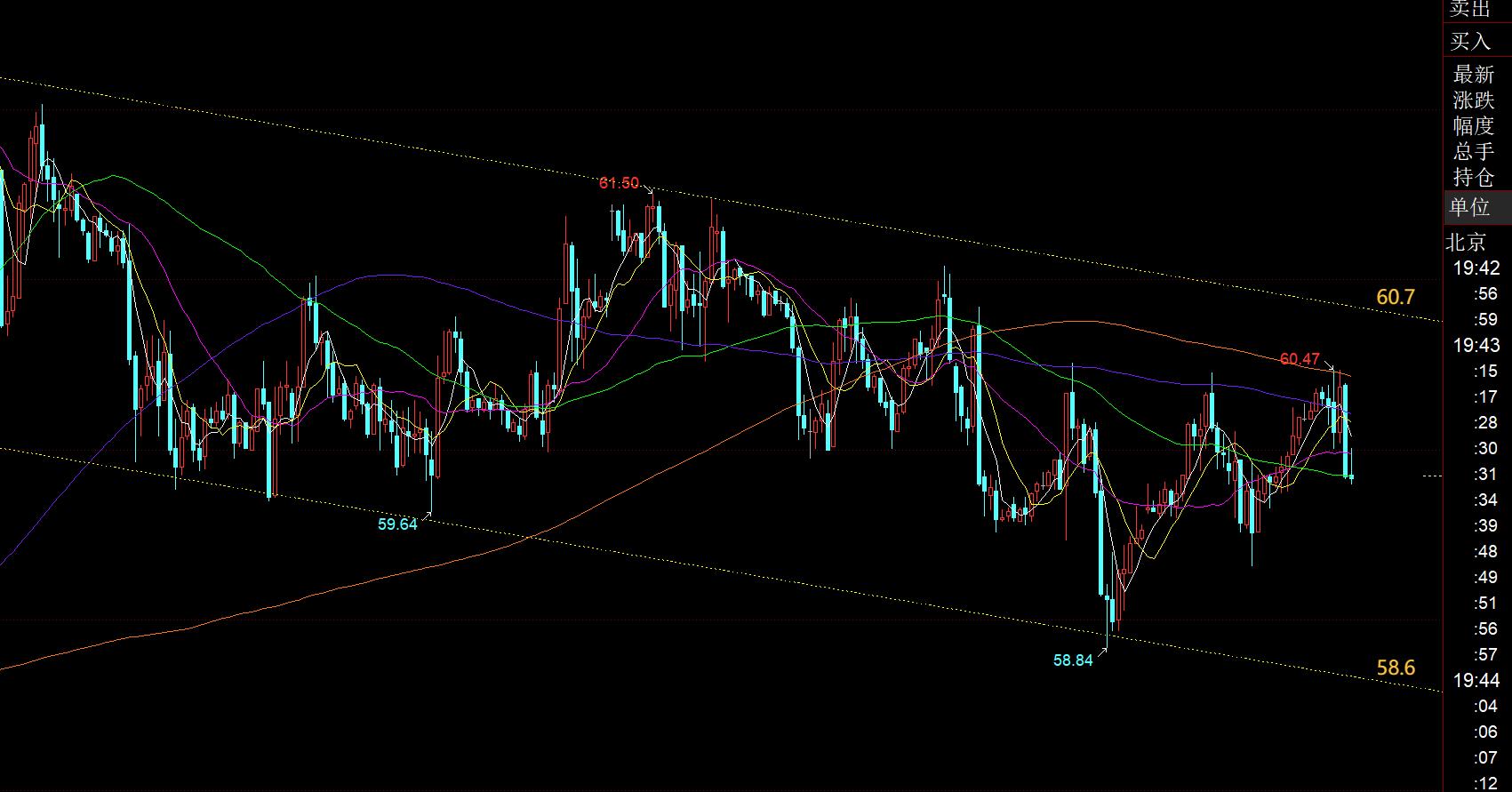 원유: 작은 노란색 채널의 변동은 계속해서 60.7입니다. 하단 레일 지지대는 58.6입니다.