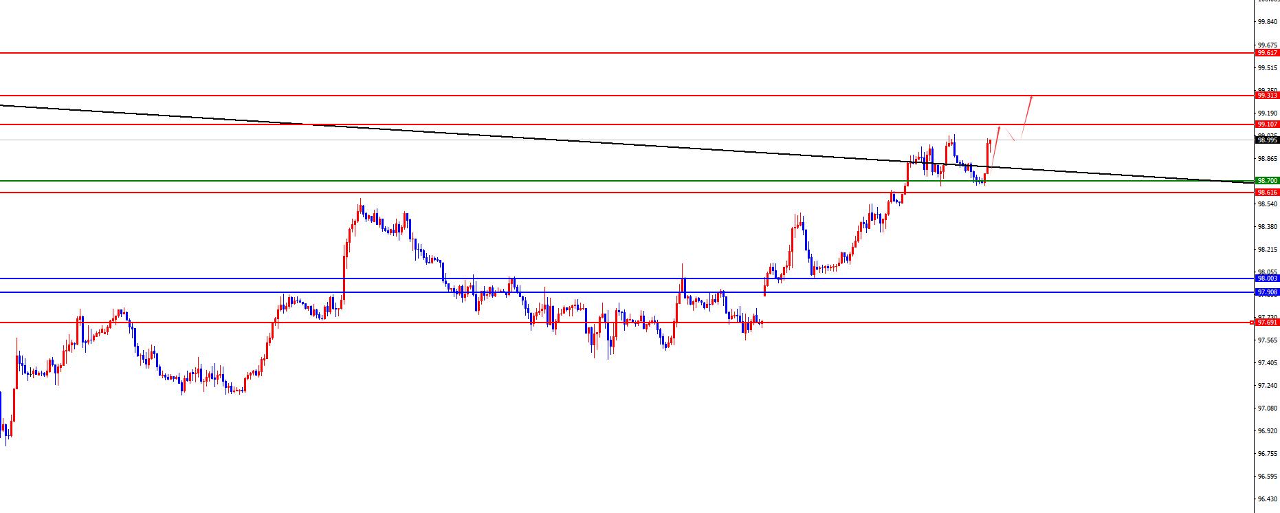Dari perspektif analisis pelbagai kitaran, pada tahap mingguan, harga baru-baru ini telah menyatukan dan turun garis mingguan utama. Sokongan mingguan semasa berada di kawasan 97.90. Kami akan terus memberi perhatian kepada penutupan harga di atas kedudukan ini setiap minggu. Sebaik sahaja ia ditutup di atas kedudukan ini, garis tengah kemudian akan meningkat. Dari tahap harian, seiring berjalannya waktu, sokongan harian semasa berada di kawasan 98, dan jalur harga di atas kedudukan ini akan meningkat lagi. Dari perspektif empat jam, harga berada di bawah tekanan pada tahap rintangan empat jam pada awal minggu lalu. Harga itu berlaku dan naik Khamis lepas, dan kemudian melangkah kembali ke garis harian dan sokongan empat jam pada hari Jumaat. Sokongan empat jam secara keseluruhannya kini berada di 98.60-70, dan harga kekal di atas kedudukan ini dalam jangka pendek. Pada jam itu, harga turun naik berhampiran garis trend yang diserlahkan semalam. Pada masa ini, jangka pendek masih yakin, jadi pada masa ini, ia akan kekal lama sehingga sokongan empat jam tidak pecah di bawah. Hanya selepas ia pecah di bawah akan jurang dilindungi. Pada masa ini, saya boleh merawatnya sebagai kaedah perdagangan di sebelah kanan.