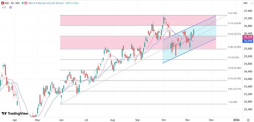 Indeks Hang Seng memecahkan saluran ke bawah sebelumnya selepas menutup lebih tinggi minggu lepas. Ia kini cuba mengembangkan saluran menaik. Tahap terobosan utama adalah pada 27,000 markah, dan rintangan yang lebih tinggi adalah pada 27,380 tinggi pada awal Oktober. Sebelum pengumuman hasil gergasi teknologi, ia mungkin mengehadkan momentumnya untuk memecahkan tanda penting. Oleh itu, perhatikan sama ada ia akan disatukan pada tahap satu bulan. Ia adalah kunci untuk memegang sokongan purata bergerak di saluran, terutamanya 26,000 tanda di mana purata bergerak 20 hari terletak.