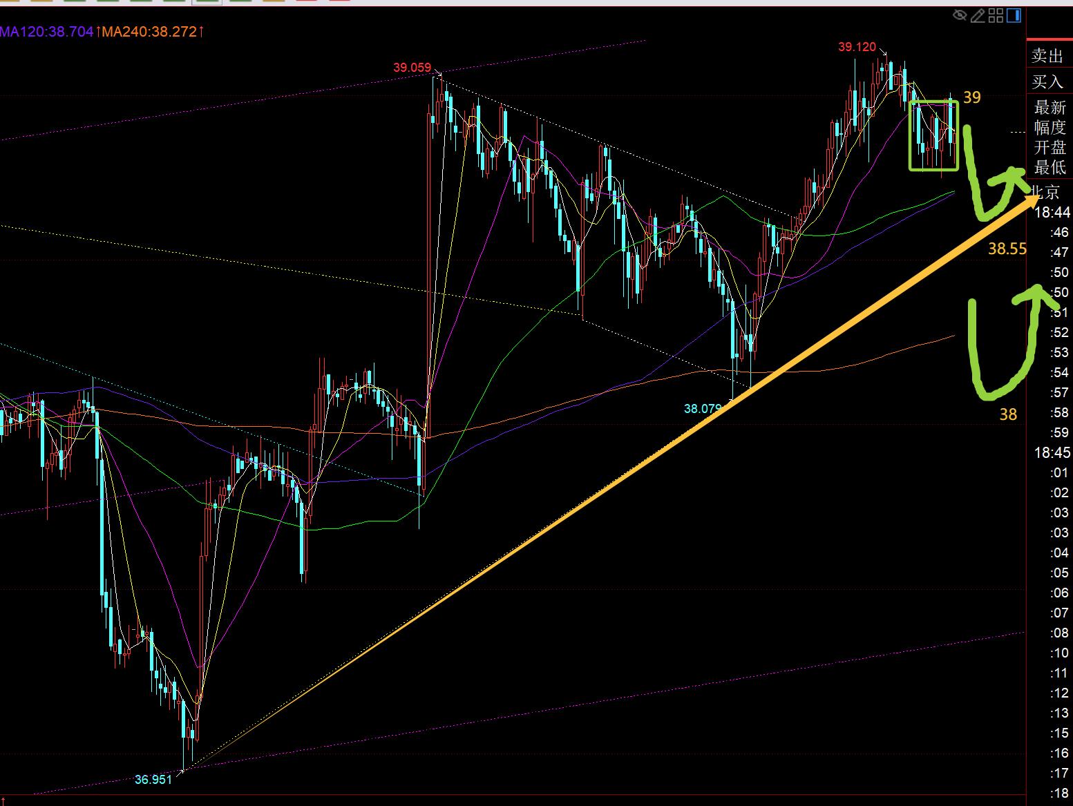 第二,白银方面:昨日再次一路强攻至39美元之上,当亚欧盘一路慢涨破高时,美盘参考研报,支撑38.8上看二次上拉,也的确涨至39.1;