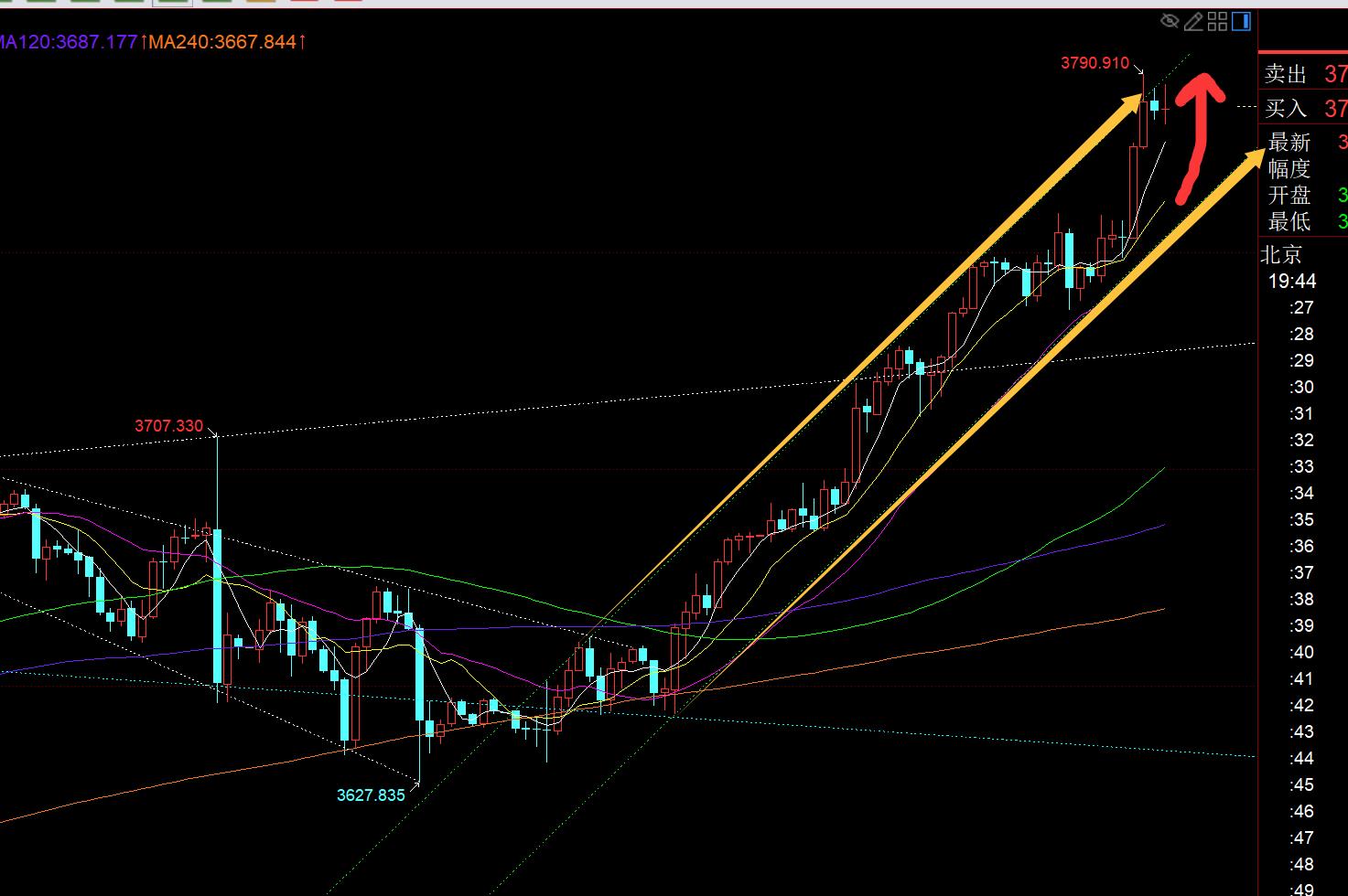 第一,黄金日线级别:昨日继续收报大阳,符合连阳单边强势再次走高,今日目前而言,还是大阳,三连阳的产生,稍微有些加速的迹象,但不是很明显,因为5均线明日大概率会上移3720一线,就离当前价格其实也不远,并未达到百米差距;不过,持续连阳逼空走高,是会逐步脱离短期均线,最终会某一天某一刻出现承压,收报冲高回落K,然后再慢慢震荡下滑去修复,待逐步靠拢短期均线,极限中轨之后,再继续走单边上拉;就今日而言,继续维持看涨,什么时候出现承压K,再考虑去走一波震荡修正;