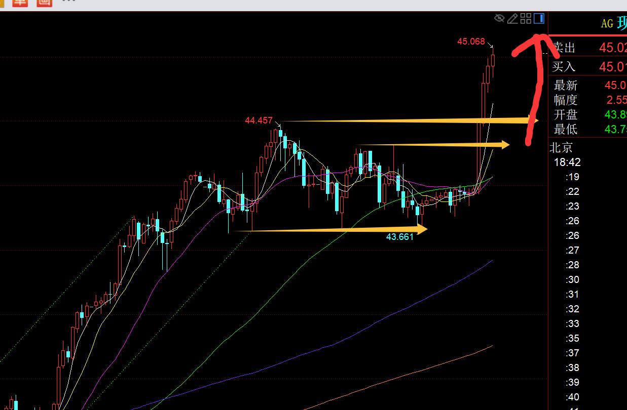 第二,白银方面:白银昨日走势相对抗跌,就是如期走一个高位区间整理,43.6上支撑,44.4下阻力,昨日依托44.3-44.2下高位也是反复先选择看跌回落,抵达43.6上目标;