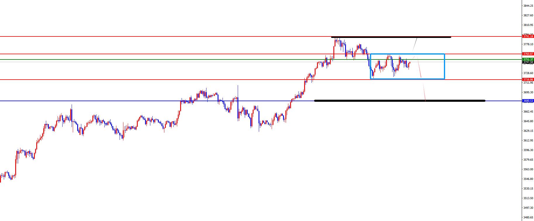 从多周期分析,首先观察月线节奏,月线上价格8月份大阳收尾,整体看价格依旧多头运行,从长线上看3000位置是长线走势的分水岭,价格在此位置之上长线多对待即可。从周线级别看,价格在周线支撑之上,目前周线多空分水岭于3445位置,价格在此位置之上中线多对待即可。从日线级别看,暂时需要关注3690区域支撑,此位置之上波段多对待,但是目前需要关注回踩。从四小时上看,周三价格下破四小时阻力,目前四小时阻力于3761位置,价格在此位置之下先看承压,只有上破才会再度上涨。一小时上看价格目前压制在下跌趋势线,同时短线有3717-3761区间震荡,所以在没有打破区间之前先看震荡,下破下边缘后关注回踩日线支撑,综合看目前3761位置为短期分水岭,在没有上破前先右侧维持空对待,意外上破则关注多头延续。