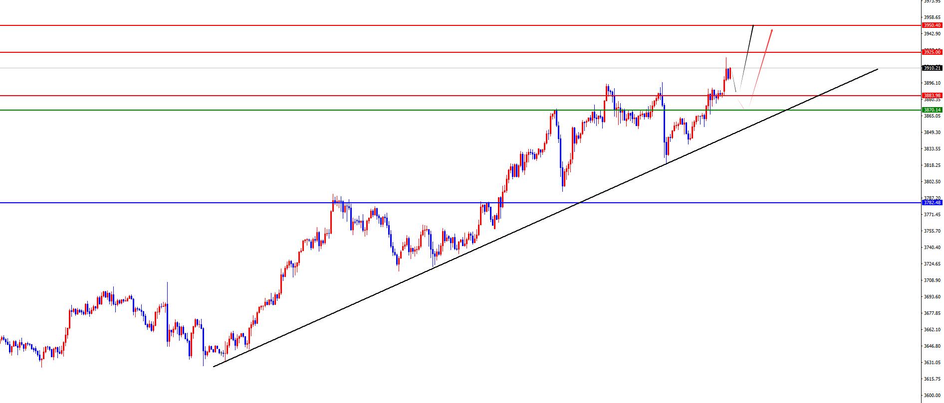 从多周期分析,首先观察月线节奏,从长线上看3130位置是长线走势的分水岭,价格在此位置之上长线多对待即可。从周线级别看,目前周线多空分水岭于3531位置,价格在此位置之上中线多对待即可。从日线级别看,暂时需要关注3782区域支撑,此位置之上波段多对待,目前继续右侧交易方式对待。从四小时上看,近期四小时上价格有两种方式,第一中是价格距离日线支撑较远时,价格依托四小时支撑上涨,价格进行下破四小时支撑后没有延续,而是依托下破四小时支撑后低点位置继续上涨。第二中距离日线较近时,价格测试到日线支撑后上涨。上周五价格明显属于第一种情况。目前四小时上暂时关注3875及3884两个支撑。一小时上,早盘直接再度强势突破3900位置,则目前强势对待,短线上早盘低点成关键,激进者在早盘低点没有下破前维持多,保守者依托四小时支撑看上涨即可。