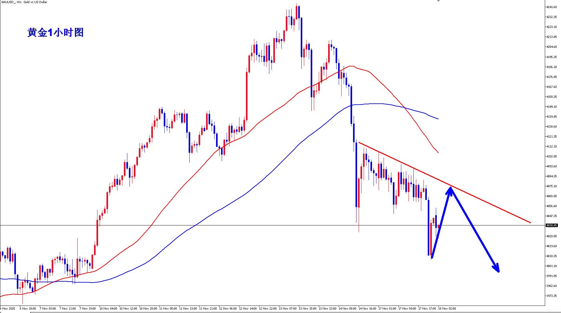 黄金1小时均线还是继续死叉向下的空头排列,黄金向下还有下跌动能,黄金反弹还是继续空。黄金1小时重心不断下移,标准的通道下行的走势,黄金早盘反弹承压4080附近还是继续逢高空,黄金短线还有继续下跌的动能。