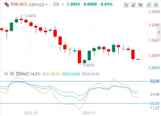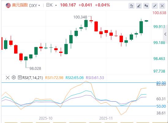 美元指数:截至发稿,美元徘徊在100.16附近。美元指数周三上涨0.59%至100.17。美联储10月会议纪要显示,尽管"几位"委员认为12月可能降息,但"许多"委员已排除此可能性,导致市场对12月降息的预期降至33%。分析师认为"形势对鸽派不利"。投资者正密切关注即将公布的美国9月非农就业数据,但由于10月报告不再发布,而11月报告将推迟至12月美联储会议后发布,分析师认为若数据疲软,可能增加美联储未来采取更激进降息措施的压力。技术面上美元指数正试图在100.00至100.15阻力位上方收稳。如果这次尝试成功,美元指数将朝下一个阻力位前进,该阻力位位于101.00至101.15区间。