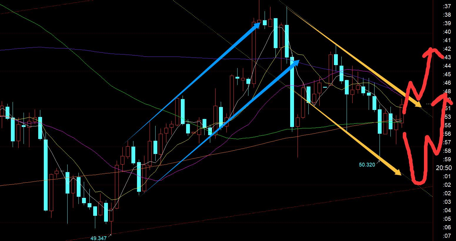 白银方面:图形和黄金走势基本一致,当前也是留意黄色通道上轨51.1一线,若能直接突破站上站稳,则可以延续反弹至51.8、52.5等;若压制回落,则关注50支撑上企稳,也是前期红色通道的下轨位置;