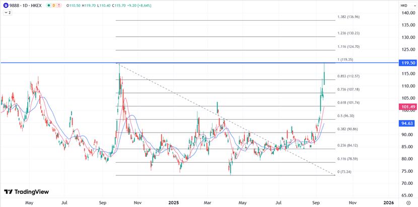 XM Hong Kong Stocks: Due to the rumors of cooperation with Apple this week, Baidu's stock price rose by more than 9% on Monday, hitting a high level since October last year, and it continued to be affected by positive news this manhã e abriu alto, xmtraders.com quase 10% de ganhos intradiados. As últimas notícias dizem que o Alibaba (09988) e o Baidu xmtraders.começaram a usar chips projetados internamente para treinar seus modelos de inteligência artificial, substituindo parcialmente os chips da NVIDIA. Esta manhã, o Alibaba abriu 5,9% maior e o Baidu abriu 3,8% maior.
