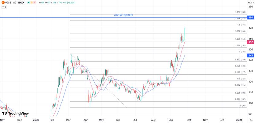 如果阿里巴巴在業務重組、雲計算和AI商業化、以及利潤增長方面能夠交出實實在在的答卷,會有更多國際資本開始重新審視並配置阿里巴巴,為股價的中長期上漲打開空間。當前技術面繼續瞄準2011年10月高位180港元為目標,突破的情況下將指向200港元。