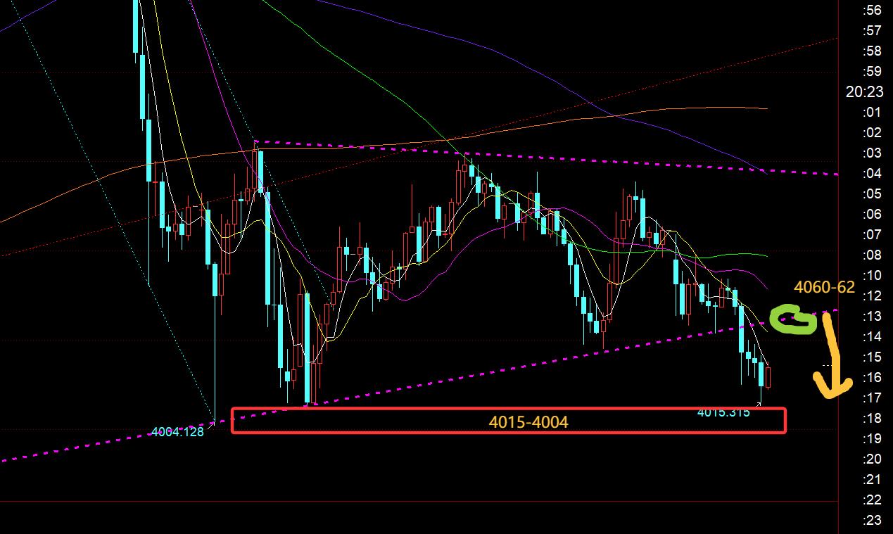 第四,黃金小時線級別:從上圖看,底部收斂三角今日歐盤期間連陰向下破位,那麼美盤前後先反彈一波,容易誘多,存在二次下行,關注通道反壓點4060上下承壓短線看跌,下方支撐4015和4004,若失守4000關口,則留意3975、3945,極限3914上;個人認為下方空間是不大的,或者時間是不長久的,2小時,4小時屆時都會處於底背離狀態,拉低是很容易突襲超跌反彈的;所以,不反彈到位之前,盡量也不去追跌;另外,若價格又突破4060上行重新回到收斂三角內,要么它擴大收斂範圍繼續整理,要么慢慢企穩上攻,屆時就不能盲目看跌;因此,今晚要去二次看跌,收盤一定不能重新回到圖中紫色三角之內,而要低位看漲則需等二次下跌走完或靠近提及的幾個支撐出現穩定信號再考慮;