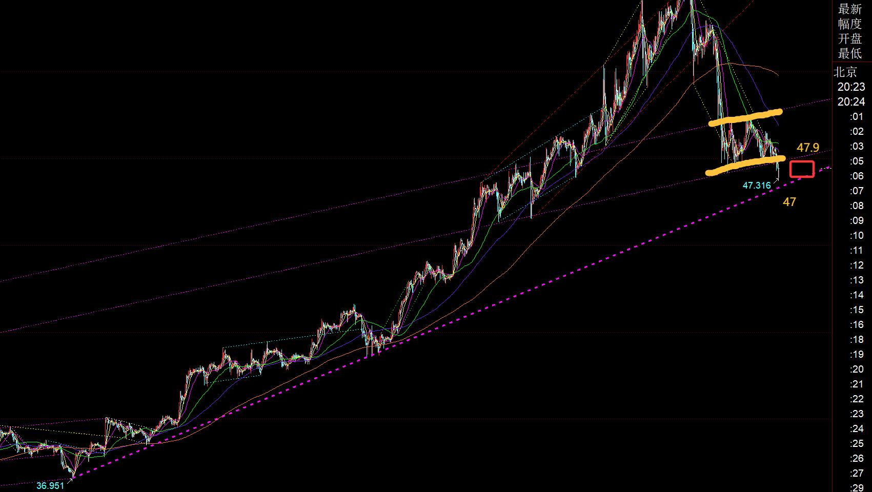 白銀方面:從圖中看,歐盤也是下破底部整理區間,47.9一線稱為反壓點,要二次下跌,一定不能突破再站上它,下方支撐就是36.95一路單邊支撐起來的紫色趨勢線,對應的支撐點47一線,觸及企穩則嘗試看漲反彈;所以留意47.9-47區間內運行,注意得失情況;